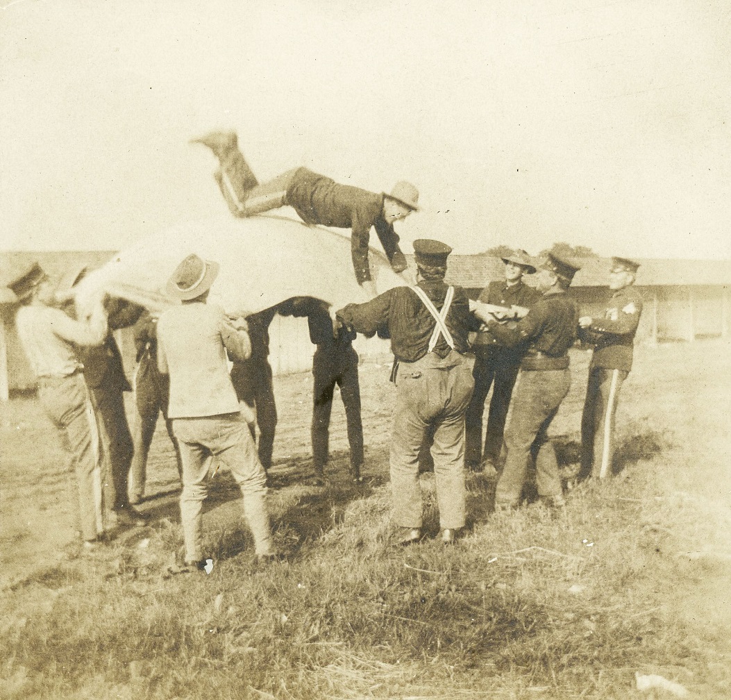 This small albumen print probably belonged to Walter H. Kleckner, a private in the Fourth Pennsylvania Volunteers, who was 27 when he enlisted. The Fourth assembled at Camp Chickamauga, in Georgia, before shipping out to Puerto Rico from Charleston, South Carolina. The men in the photo are tossing one of their comrades in a blanket, also called “kangarooing” at the time.