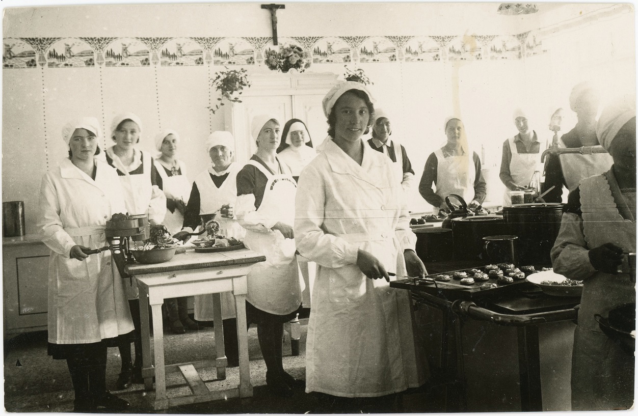 This photo postcard likely originated in northern Europe. The presence of a nun at the back of the room and a crucifix on the wall suggest the class may have been offered by a convent or other Catholic organization. The back provides no information.