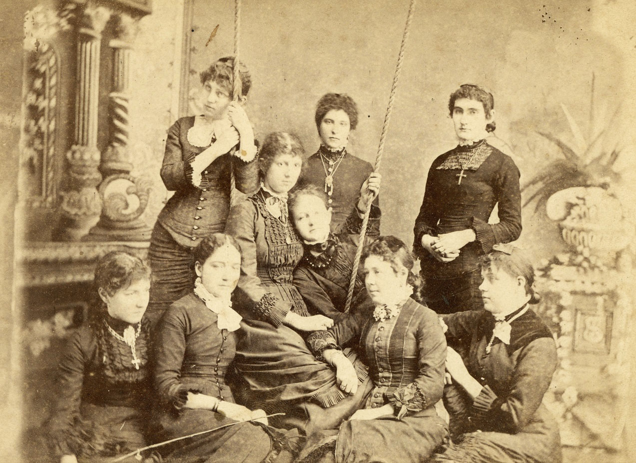 This albumen print was made by a photographer identified as L.D. Austin in South Haven, Michigan. The young women appear to be in their late teens, and are grouped around a swing, which could symbolize the carefree days of youth. The sitter at lower left is also holding a long stick … another relic of childhood, or maybe a graduation symbol of some kind?