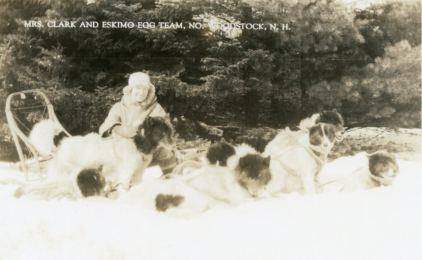 According to the Fall 2008 newsletter of the Upper Pemigewasset Historical Society, in 1928 Ed and Florence Clark moved to the town of Lincoln in the White Mountains of New Hampshire to raise sled dogs and demonstrate their abilities for tourists.  On April 5, 1932, Florence summited Mt. Washington with a team of dogs, becoming the first woman and only the second person to do so.  The postcard above has a handwritten date on the back, “April 1932,” indicating it was taken at the time of her historic ascent.