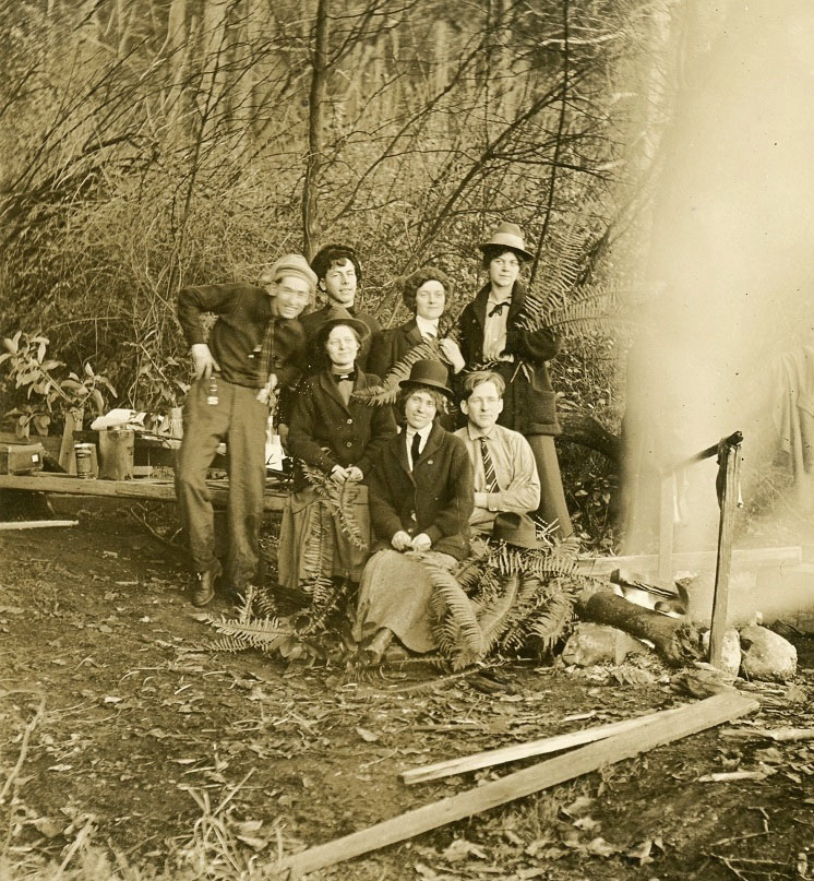 This postcard shows a group of Seattle Pacific College students on a camping trip in the temperate rainforest near Seattle. The image was reproduced in the June 1914 school yearbook, The Cascade, in a feature titled “Jolly Hikers.” The man at the back, second from left, is Winfred Nathan Thuline (1886-1982). Eventually I hope to identify the other students.