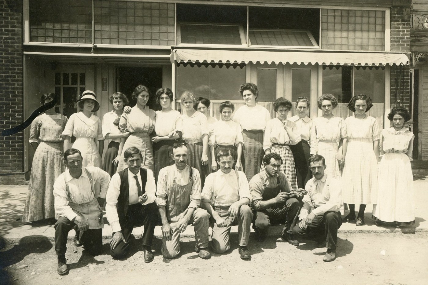 The man at far left is wearing an apron with something dark on it, perhaps oil or ink. The man next to him is holding a pencil. Between them a woman’s hand is visible which also has something dark on it. She’s trying not to touch her skirt with it.