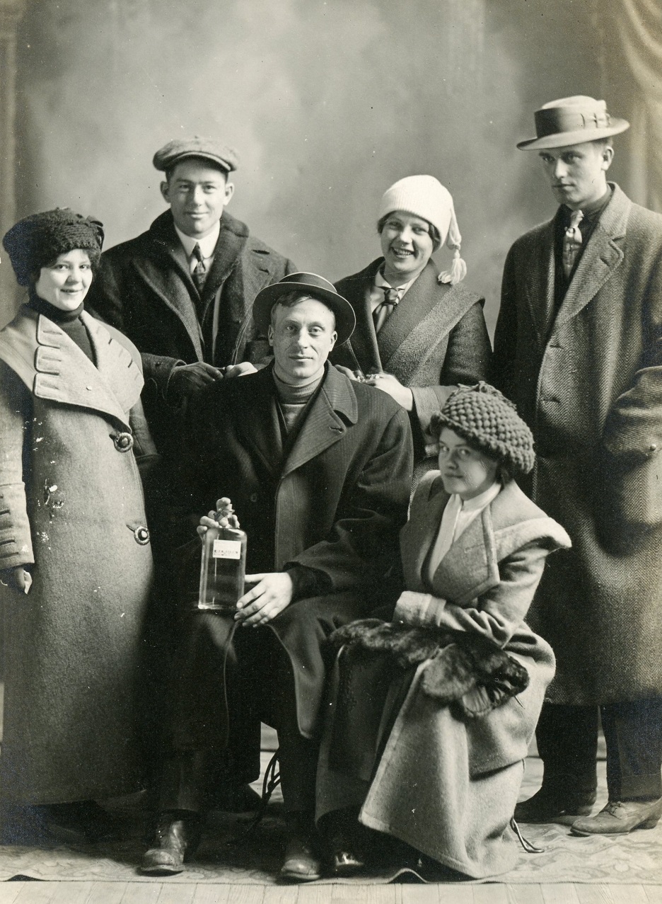 The seated man is holding a clear glass bottle, but the label isn’t readable even at high resolution. I suspect the group was simply using the bottle as a fun prop. Except for Albin, everyone is smiling. This portrait of a group of friends radiates warmth on a cold Midwestern winter’s day.