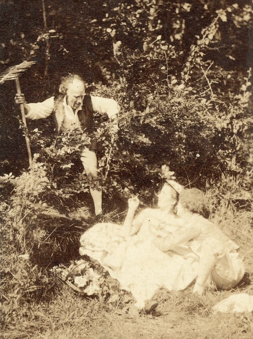 We can see from this scene that parents have overreacted to teenage behavior since at least the 1850s. A girl and a boy lounge in the grass. A basket of wildflowers lies at the girl’s feet. The boy innocently offers her a small bouquet. Meanwhile, the girl’s father discovers them and charges through the bushes with a rake. Parents can be so uptight!