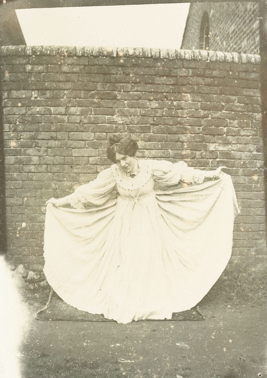 Given the Empire line of the dress ( no waist, with the skirt starting from under the breasts and fashionable about 100 years before this photo was taken), I think this may be a dress for a costume party. Is there any clue to a date? I’m thinking 1910s based on her hairstyle and the fact that it is taken by an amateur, perhaps with a Brownie?