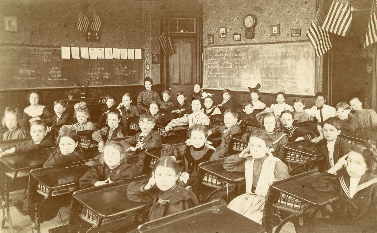 At upper left on the chalk board on the left side of the room is the following: “Fifth Grade, East Building, Feb. 21, 1906.” Below and to the right, on the same board, are three math problems with names of students in neat script next to them: Harold Huston, Cornelia Fulton, and Zolabelle.