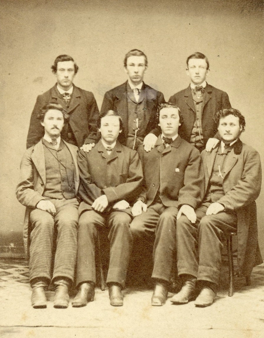 One hundred and fifty-four years ago this week, seven friends sat for a portrait at Nathaniel L. Merrill’s Photographic Gallery in Springfield, Vermont. They look young enough to be in high school, or perhaps recent graduates. The carte-de-visite photo has a revenue stamp on the back, affixed and cancelled by the photographer on December 22, 1864. Were these fellows about to head home for Christmas or winter break? The end of the war was still six months away, but they had no idea how much longer it would last.