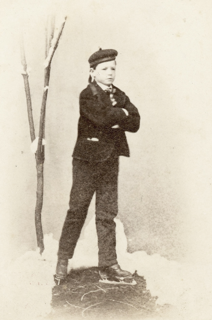 I first thought he was wearing boot skates that were first invented about 1848 but on closer inspection, he is wearing the clip on type skate. In the photo, his shoe is shorter then the length of the skate. Makes sense that, if the picture was taken in a studio which it most probably was given the fake snow, that the photographer would have strap on or clip on skates that could be used with more clients with larger or smaller feet.