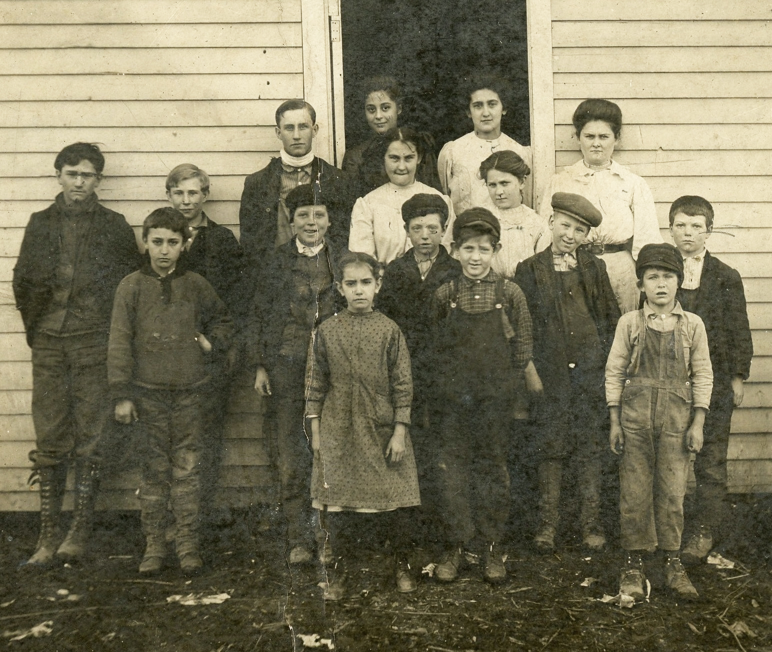 My father (b. 1924) went to school in a similar one-room school in rural Kansas, all ages/grades together. He told me that the older kids often helped the younger ones. That was the only way a teacher could manage, given she had to teach all grades, not just one or two. My father’s older sister went on to become a teacher herself, so I imagine the older girls took on most of teaching assistant duties, trying on the job of teacher for size before graduating.