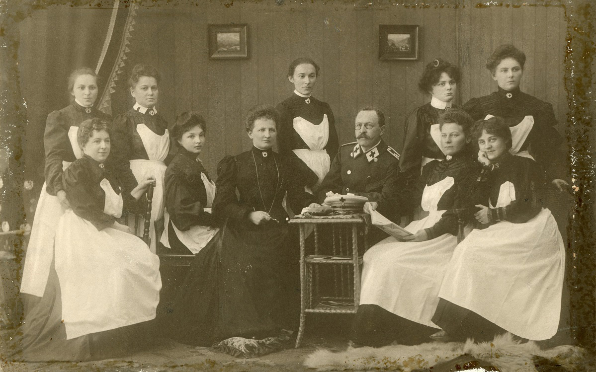 I hadn’t really thought about the different collars. The man’s uniform made me wonder if the group might have been affiliated with a military hospital. But I don’t think it’s a military uniform. And if the women were wearing military-issue outfits, the outfits would all be exactly the same, without the different collars. So your observation about the collar is important. I wish I could offer more information!