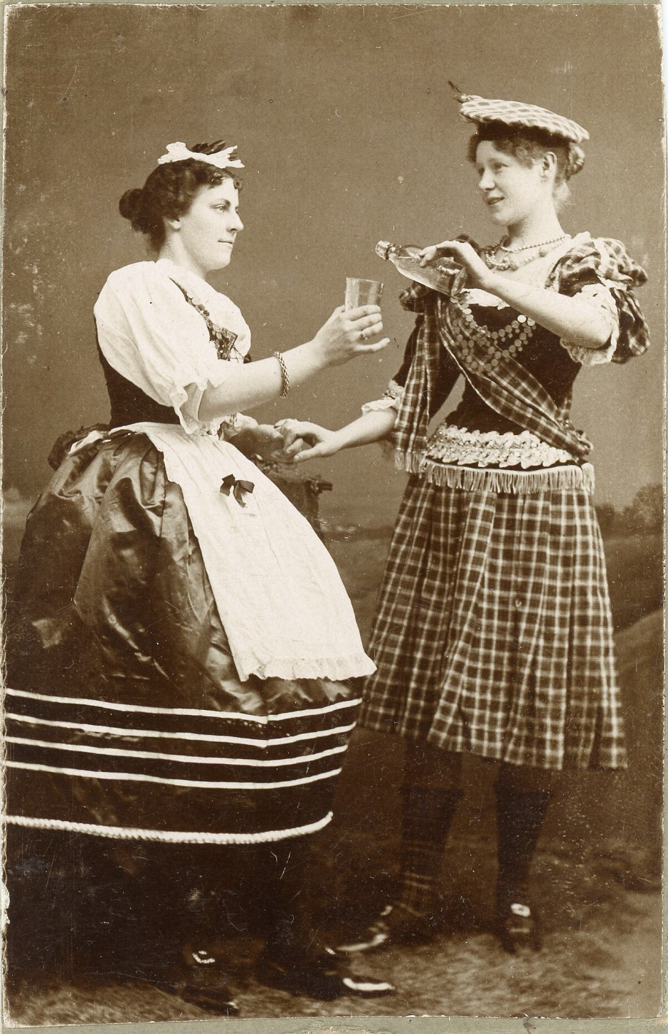 I’ve had this photo for several years.  A few days ago I was listening to Auld Lang Syne, and the photo popped into my head.  Could the scene have been meant to represent two women celebrating the New Year?  The tartan costume of the young lady on the right could be meant to suggest the classic Scottish song.  The costume of the young lady on the left seems somewhat less distinctive and more universal.  Another clue may be that the two women are holding hands.  According to the entry for Auld Lang Syne in Encyclopedia Britannica, it’s customary for celebrants at a Scottish Hogmanay (New Year’s celebration) to sing the song while standing in a circle and holding hands.  I wonder if that’s still true.