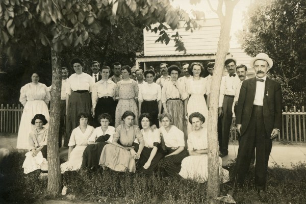 This photograph shows a group of coworkers at an unidentified location. A man at lower right is conspicuously holding what appears to be a screwdriver. The man at far left is wearing an apron with something dark on it, perhaps oil or ink. The man next to him is holding a pencil. Between them a... Continue Reading →