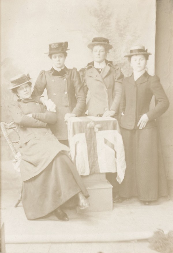 These college-age women have a determined air about them, as if they're on a mission. They've arranged themselves around a pedestal with a Union Jack flag draped over it, adding a patriotic aspect to the portrait and perhaps suggesting political activism. Were they participants in the women's suffrage movement? What does the ribbon on the... Continue Reading →