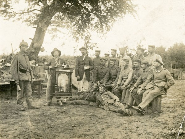 This German Feldpost (field/military) postcard is dated Aug. 19, 1916. Infantrymen are being entertained by a man in civilian clothes holding a music box with the words "Automate à musique" on the front. Perched calmly on top of the music box is a black and white cat. A second man in civilian clothes stands a... Continue Reading →
